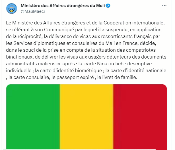 Ce 22 août 2023, le ministère des Affaires étrangères et de la Coopération internationale du Mali, par une correspondance, a révisé sa positon sur l’application de la réciprocité sur la suspension de la délivrance de visas aux ressortissants français par ses services consulaires.