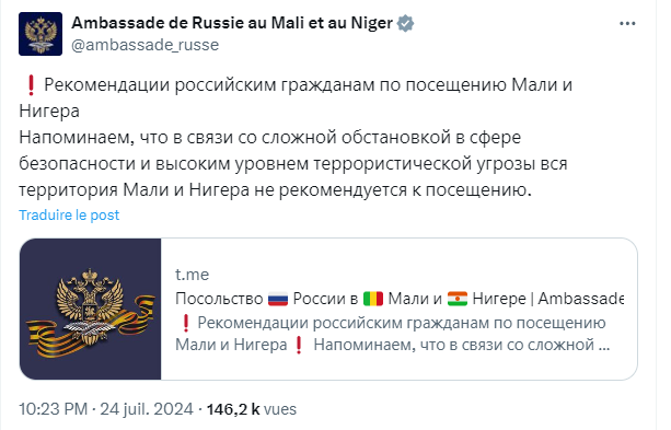 C’est une recommandation aux citoyens russes concernant les visites au Mali et au Niger que l’ambassade de Russie au Mali et au Niger a publié ce Mercredi 24 Juillet 2024. « Nous vous rappelons qu’en raison des conditions de sécurité difficiles et du niveau élevé de la menace terroriste, il est déconseillé de se rendre sur l’ensemble du territoire du Mali et du Niger ». peut-on lire sur les canaux digitaux, X et Télégram de l’ambassade de Russie au Mali et au Niger.