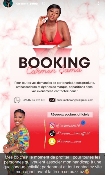 Carmen Sama en retour n’a pas hésité une seule seconde à répondre à la Spendja. La mère de la petite Rafna l’a fait savoir une publication sur son compte Instagram. « Mes bb, c’est le moment de profiter. Pour toutes les personnes qui veulent associer mon handicap à une quelconque activité; partenariat et tout, contactez vite mon agent avant la fin de ce buzz », dixit elle.