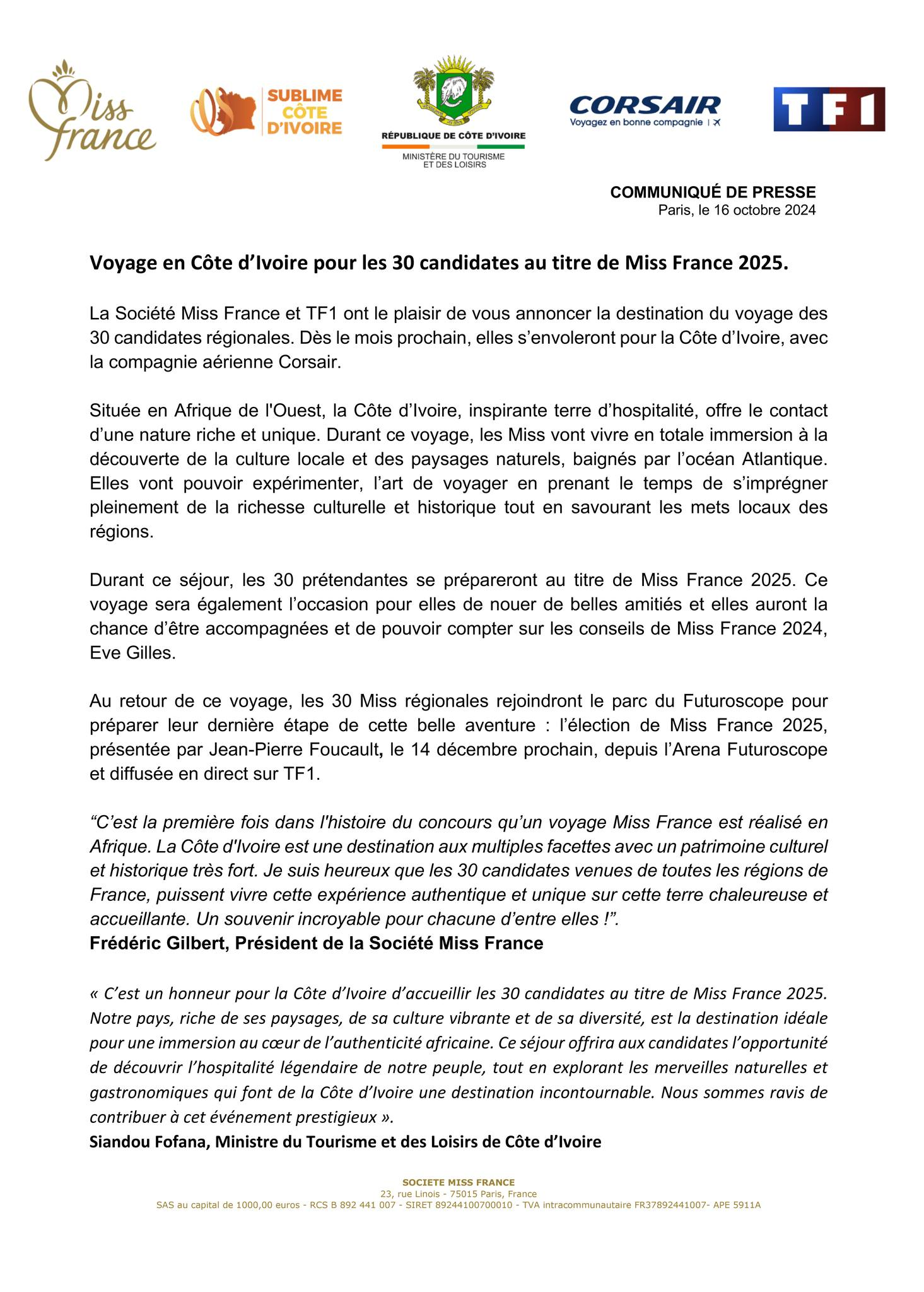 Le président de la Société Miss France, Frédéric Gilbert, se réjouit de cette initiative inédite : « La Côte d’Ivoire, avec son patrimoine culturel et historique, est une destination idéale. Je suis ravi que les candidats puissent vivre cette expérience unique sur cette terre accueillante. Ce séjour marquera chacune d’elles pour la vie. »