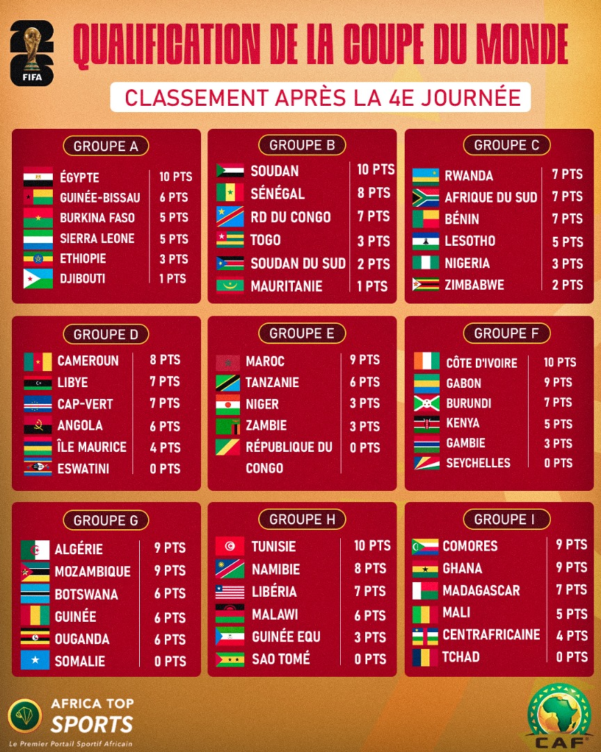La quatrième journée des éliminatoires de la Coupe du monde 2026 en Afrique s’est terminée ce mardi, redessinant les classements des groupes.