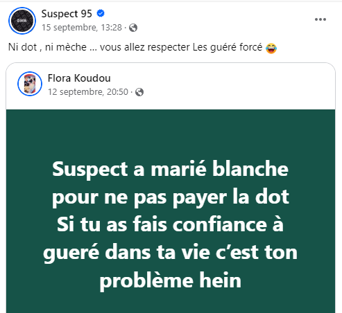 En effet, Suspect 95 a saisi cette occasion pour expliquer les raisons qui l’ont conduit à choisir une femme d’origine française. En partageant le post de son admirateur, le président du Syndicat a ajouté en commentaire : « Ni dot, ni mèche… Vous devez désormais accorder du respect aux Guéré, forcé« .