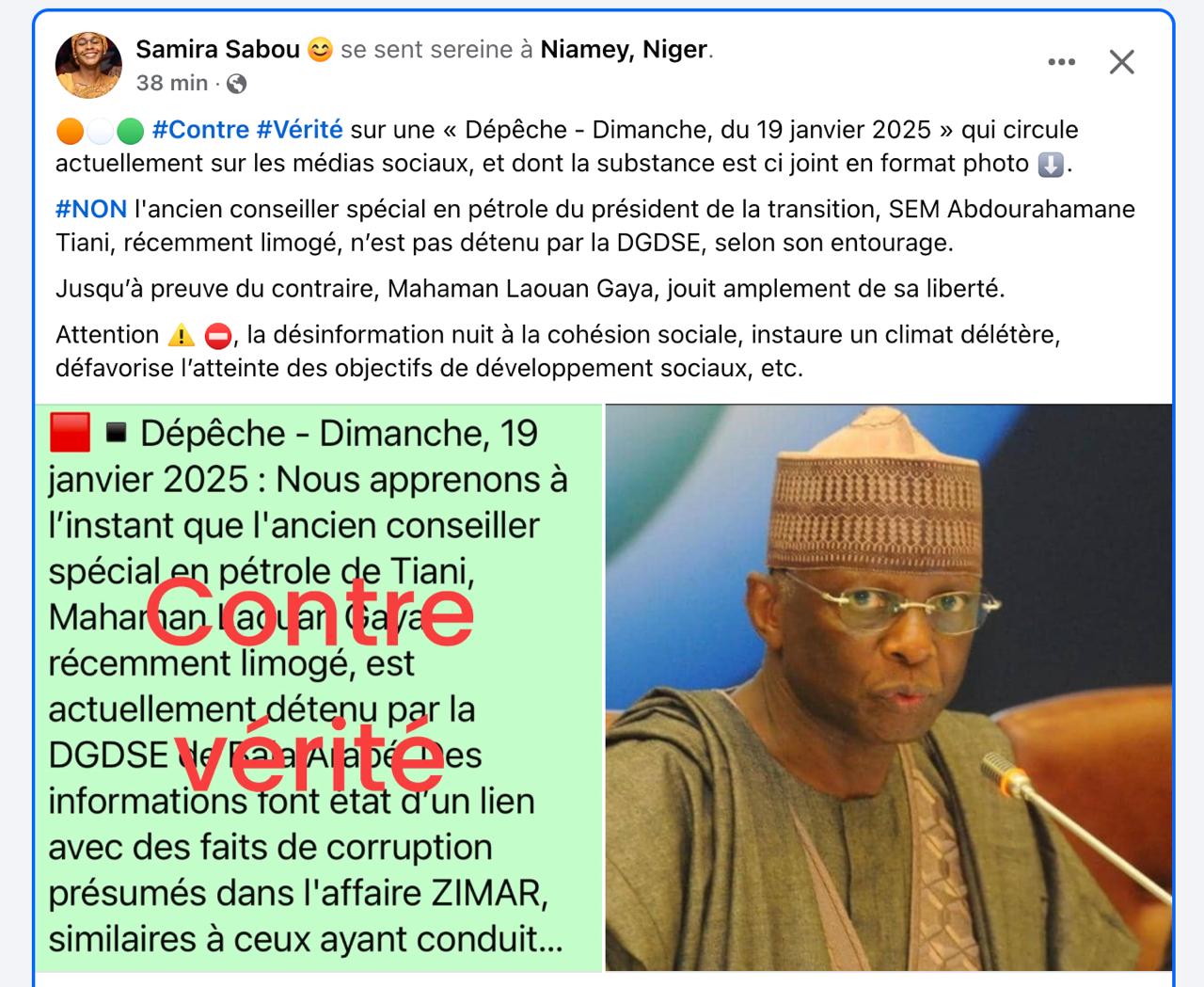 Sur sa page Facebook, la journaliste nigérienne a contesté les rumeurs entourant l’arrestation de l’ancien ministre. Elle a déclaré : « NON, l’ancien conseiller spécial en pétrole du président de la transition, SEM Abdourahamane Tiani, récemment limogé, n’est pas détenu par la DGDSE, selon son entourage. Jusqu’à preuve du contraire, Mahaman Laouan Gaya jouit pleinement de sa liberté. »