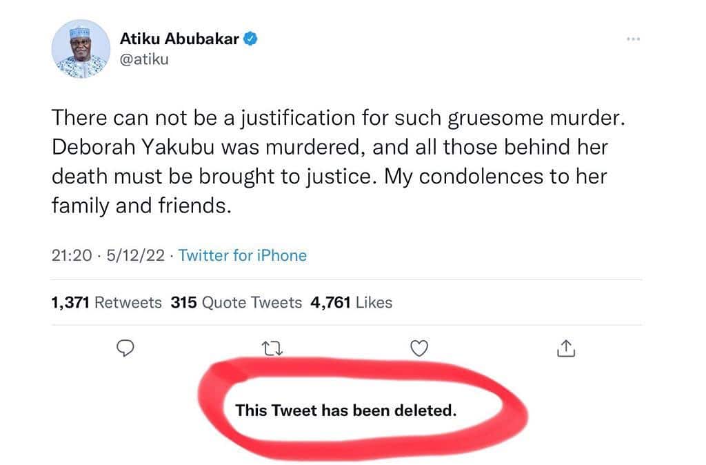 L’action du candidat à la présidence Atiku Abubakar est la preuve que les politiciens ne se soucient que de leurs votes. Réagissant à l’incident, Atiku a condamné le crime odieux via des messages sur ses pages Twitter et Facebook. Mais, quelques heures après, le candidat à la présidence de 2023 au Nigéria a supprimé les messages sur les médias sociaux condamnant le meurtre de Deborah Samuel.