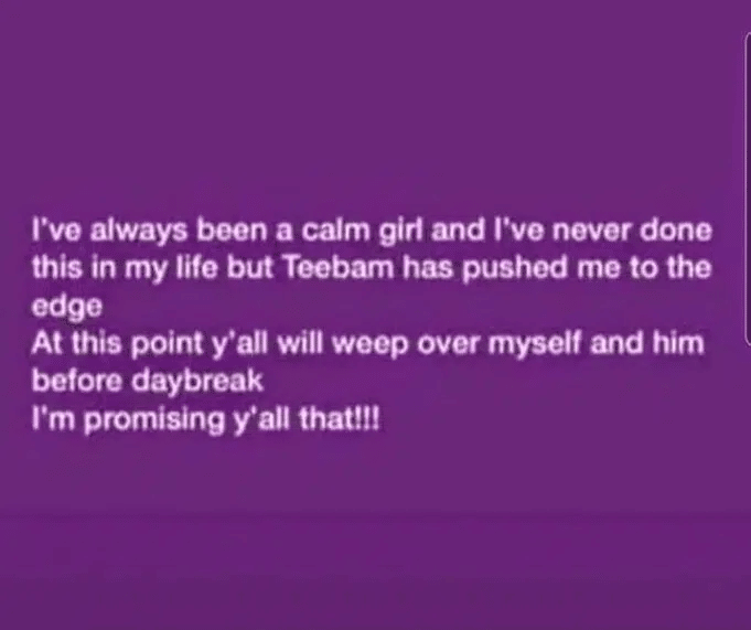 Avant de passer à l’acte, la jeune femme avait inondé la session de son statut WhatsApp, prévenant qu’elle était sur le point de commettre l’irréparable. En substance, l’épouse avait mentionné qu’elle était « une fille calme » et que son mari « l’avait poussée à bout. « J’ai, toujours, été une fille calme, et je n’ai jamais fait ça dans ma vie, mais Teebam (son mari, NDLR) m’a poussé à bout. », avait posté l’épouse, qui était rongée par des soupçons d’infidélité.