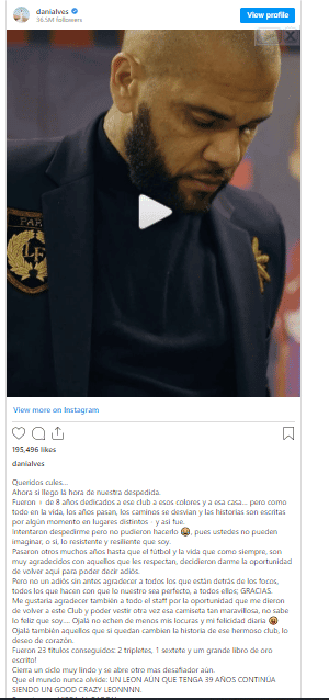 Dans un message posté sur son compte Instagram ce mercredi, Dani Alvès a annoncé son départ du FC Barcelone. Le défenseur brésilien se retrouve sur le marché des transferts.