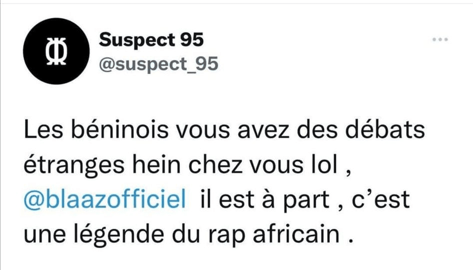 En légende de cette capture, le fils de jésus a profité pour répondre à tous ses compatriotes qui jettent régulièrement du discrédit sur les artistes béninois. « Si vous respectez pas vos artistes , il faut savoir qu’à l’extérieur du pays personne ne manque de respect à BLAAZ : Toute cette grande carrière , tout ce qu’il a fait pour le rap Beninois aujourd’hui vous avez déjà oublié. C’est pas pour rien Suspect 95 a mentionné « vous avez des débats étranges chez vous » a déploré l’étoile de la musique urbaine au Bénin.