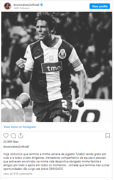 Après une dernière saison disputée en D1 grecque cette année, le défenseur portugais Bruno Alves a décidé de mettre un terme à sa carrière. Le désormais ex joueur a annoncé la nouvelle via un message publié sur son compte Instagram ce dimanche.
