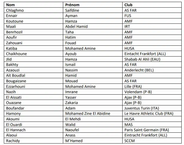 Dans cette liste de 25 Lions, on retrouve les finalistes de la dernière CAN U17, Abdelhamid Ait Boudlal et Adam Boufandar. Les deux forment le noyau dur avec l’arrière droit du PSG Naoufel El Hannach et le gardien du LOSC Mohamed-Amine Ezzarhouni. Les Lions de l’Atlas effectueront leur stage au Qatar.