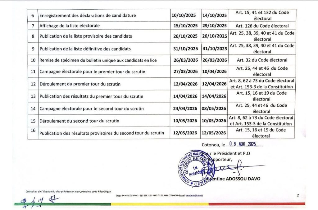 La Commission Électorale Nationale Autonome (CENA) a publié, le 8 août 2025, le calendrier officiel de l’élection présidentielle prévue en 2026. Signé par la rapporteure Laurentine Adossou Davo, ce document fixe les grandes étapes du processus électoral, dont les deux tours se tiendront respectivement le 12 avril et le 10 mai 2026.