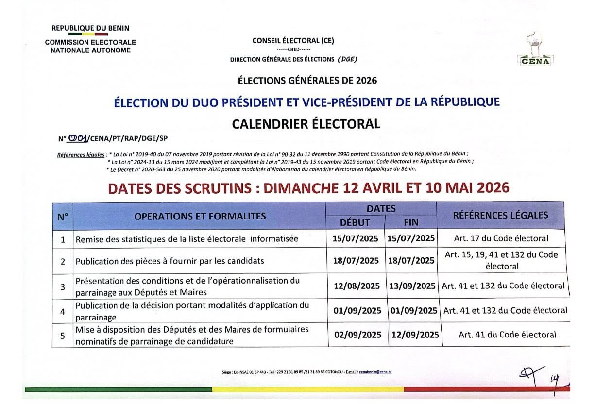 La Commission Électorale Nationale Autonome (CENA) a publié, le 8 août 2025, le calendrier officiel de l’élection présidentielle prévue en 2026. Signé par la rapporteure Laurentine Adossou Davo, ce document fixe les grandes étapes du processus électoral, dont les deux tours se tiendront respectivement le 12 avril et le 10 mai 2026.