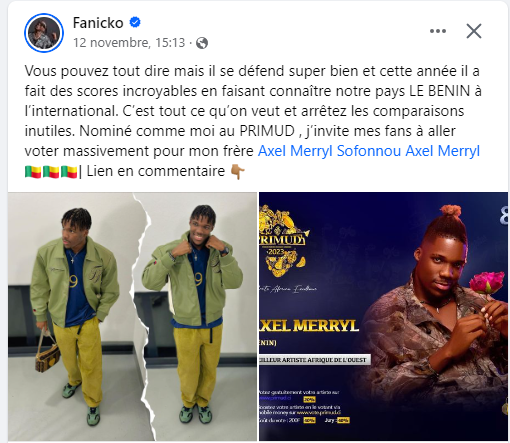 « Vous pouvez tout dire mais il se défend super bien et cette année il a fait des scores incroyables en faisant connaître notre pays le Bénin à l’international. C’est tout ce qu’on veut et arrêtez les comparaisons inutiles. Nominé comme moi au Primud, j’invite mes fans à aller voter massivement pour mon frère Axel Merryl Sofonnou dit Axel Merryl| Lien en commentaire », peut-on lire sr sa page Facebook.