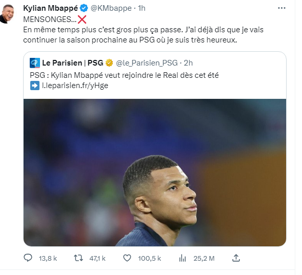 Avec un message posté sur son compte Twitter, ce mardi, Kylian Mbappé a démenti les rumeurs sur ses supposées envies de départ vers le Real Madrid cet été.