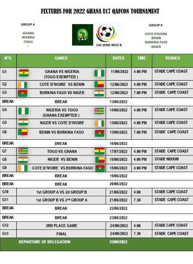 Les Écureuils cadets qui sont actuellement en stage de préparation lanceront leur campagne par un choc contre les Éléphanteaux. Un adversaire assez coriace que la team U17 du Bénin va devoir écarter pour espérer aller loin dans ce tournoi. La rencontre aura lieu le 12 juin au stade Cape Coast. Les béninois joueront leur deuxième match face au Burkina Faso (le 15 juin) avant de croiser le Niger lors de la dernière journée (18 juin).