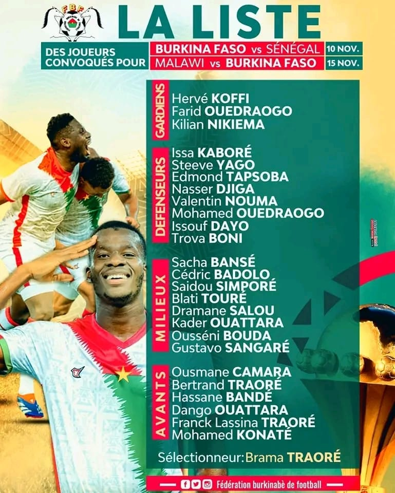 Pour ces deux rendez-vous, le sélectionneur Brama Traoré a convoqué un groupe de 25 joueurs. Les stars de l’équipe, à l’instar du défenseur central Edmond Tapsoba, qui évolue au Bayer Leverkusen, Issa Kaboré ou encore l’attaquant Dango Ouattara font partie de la liste.