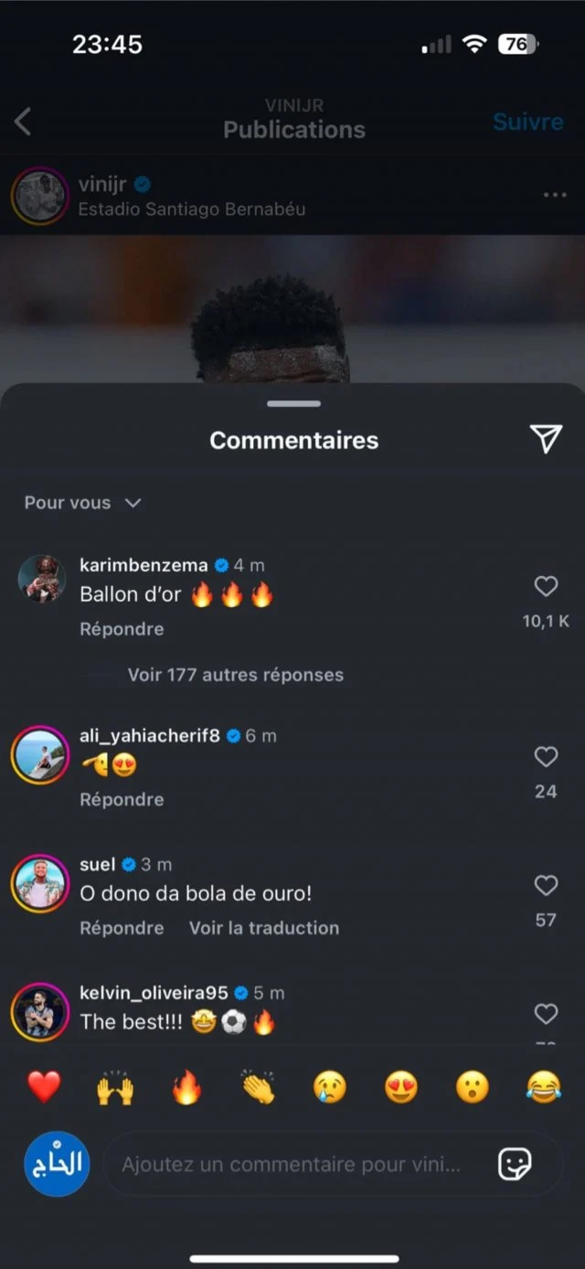 Une prestation XXL qui lui a valu les éloges d’un certain Karim Benzema. Ancien de la maison, l’attaquant d’Al Ittihad a félicité la star auriverde pour sa démonstration de force. En commentaire d’une publication de Vinicius sur Instagram, le Français a écrit «Ballon d’Or», le tout accompagné de plusieurs emojis flammes.