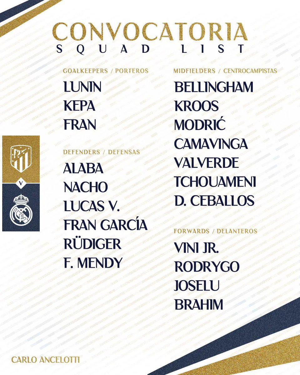 L’entraineur du Real Madrid, Carlo Ancelotti, a dévoilé sa liste des joueurs retenus pour la réception de l’Atletico ce dimanche en Liga. Vinicius Junior fait partie du groupe.