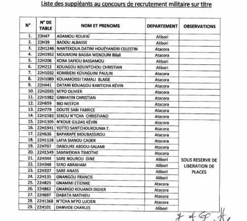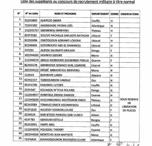 Des candidats admis au concours de recrutement de militaires sont convoqués par le chef d’Etat-major général des forces armées béninoises pour participer à la phase de visite médicale.