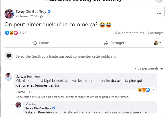 Surpris par les commentaires, Serey Die a supprimé la publication qui évoque sa mort. « On peut aimer quelqu’un comme ça? », a-t-il indiqué avant de répondre à un commentaire désobligeant. « Mon frérot c’est rien ça , la mort est constamment présente heinn . Ou bien ceux qui meurent tous les jours ne connaissent pas DIEU? », a écrit Serey Die.