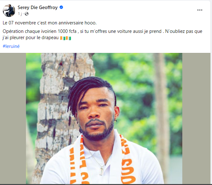 Bien que le message soit empreint d’ironie, il souligne sa situation actuelle et s’accompagne du hashtag #leruiné. « Le 07 novembre c’est mon anniversaire hooo. Opération chaque ivoirien 1000 fcfa , si tu m’offres une voiture aussi je prends. N’oubliez pas que j’ai pleuré pour le drapeau. », peut-on lire sur sa page Facebook.