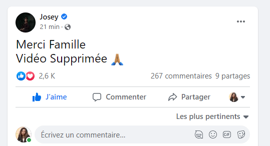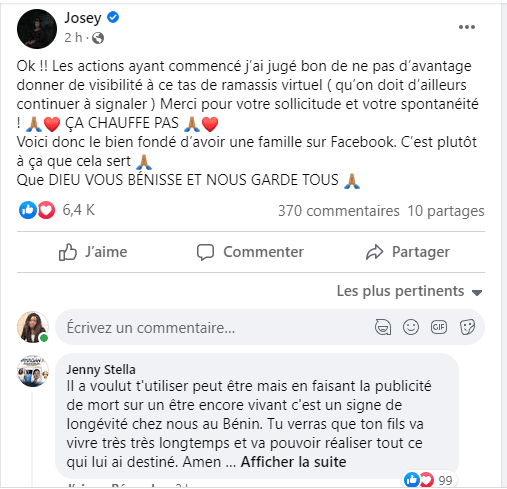 . « Sur les réseaux sociaux, il y a de cela quelques heures, on a appris la triste disparition de l’enfant de l’artiste-musicienne Josey, de son vrai nom Gnakrou Josée Priscille. Chers auditeurs, voilà une nouvelle qui est venue mettre tous les fans de l’artiste-musicienne Josey dans une grande désolation », a déclaré le youtubeur dans sa vidéo.