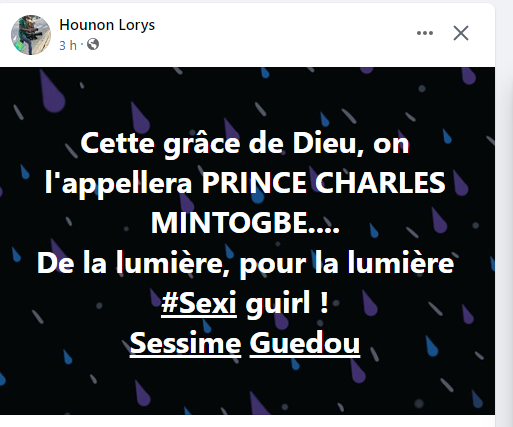 Selon le journaliste Lorys Hounnon et bien d’autres internautes, le prénom du futur bébé de Sessimè et Nikanor doit être un dérivé de Charles Juste pour rendre hommage au père de la chanteuse emporté par la maladie alors que sa fille attendait son premier enfant. « Cette grâce de Dieu, on l’appellera Prince Charles Mintogbé », a-t-il proposé.