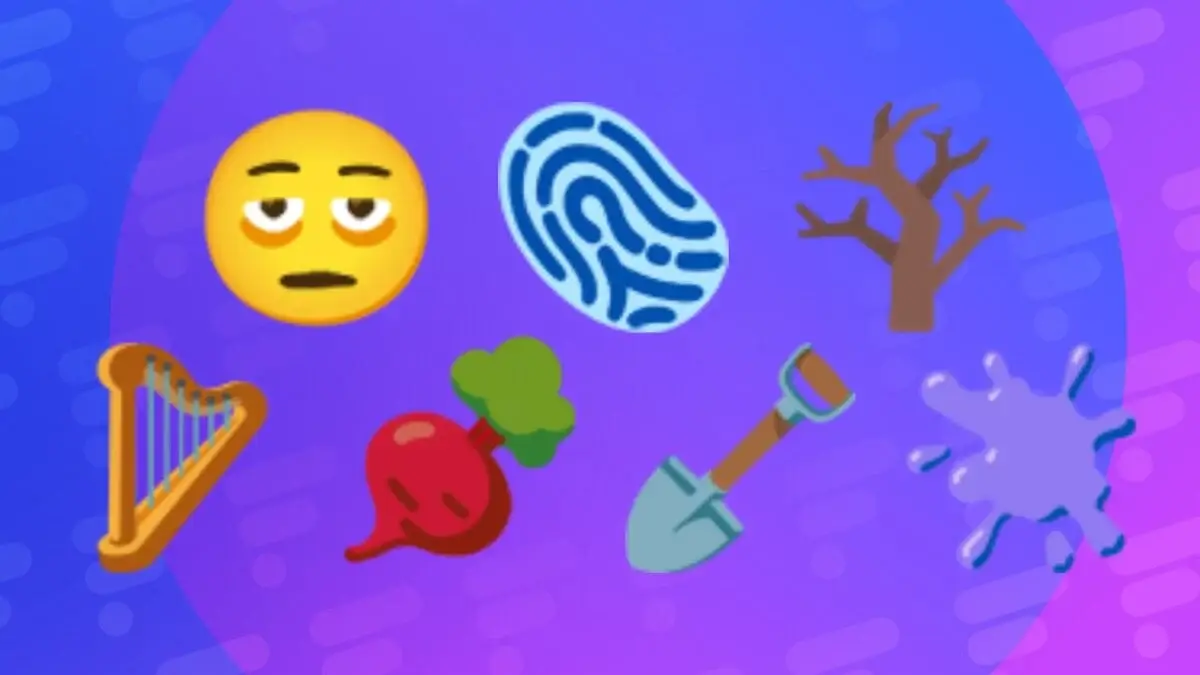 Les candidats à l’ajout incluent une empreinte digitale, une harpe, une pelle, un arbre dénudé, un visage fatigué avec des cernes, un radis et une tache de peinture.