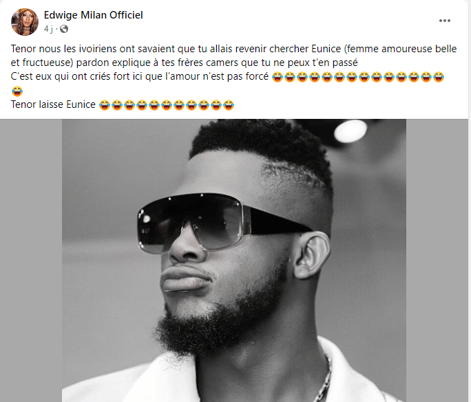 Même si Eunice Zunon n’a pas réagi à cette polémique, des ivoiriens sont montés au créneau pour fustiger cette possible réconciliation. « Tenor, nous les ivoiriens on savaient que tu allais revenir chercher Eunice (femme amoureuse belle et fructueuse) pardon explique à tes frères camers que tu ne peux t’en passer. C’est eux qui ont crié fort ici que l’amour n’est pas forcé. Tenor laisse Eunice », a écrit Edwige Milan.