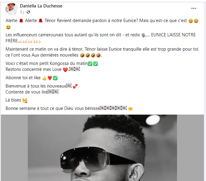 « Alerte Alerte! Ténor Reviens demander pardon à notre Eunice? Mais qu’est-ce que c’est? Les influenceurs camerounais tous autant qu’ils sont, on dit et redit … Eunice laisse notre frère! Maintenant, ce matin on va dire à Ténor, Ténor laisse Eunice tranquille, elle est trop grande pour toi … », a-t-il publié en légende ‘un cliché de Tenor.