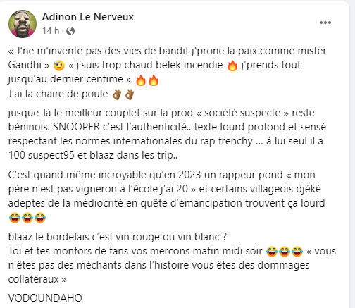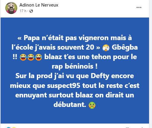 « Gbêgba !! Blaaz t’es une tehon (honte Ndlr) pour le rap béninois ! Sur la prod j’ai vu Defty encore mieux que suspect95, tout le reste c’est ennuyant surtout Blaaz on dirait un débutant », a-t-il réagit.