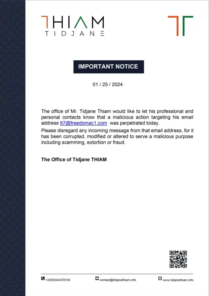 « Le cabinet de M. Tidjane Thiam souhaite informer ses contacts professionnels et personnels qu’une action malveillante visant son adresse email [email protected] a été perpétrée ce jour. Veuillez ignorer tout message entrant provenant de cette adresse e-mail, car il a été corrompu, modifié ou altéré à des fins malveillantes, notamment l’escroquerie, l’extorsion ou la fraude », peut-on lire dans la note. Pour l’heure, les auteurs de cet acte ne sont pas connus.