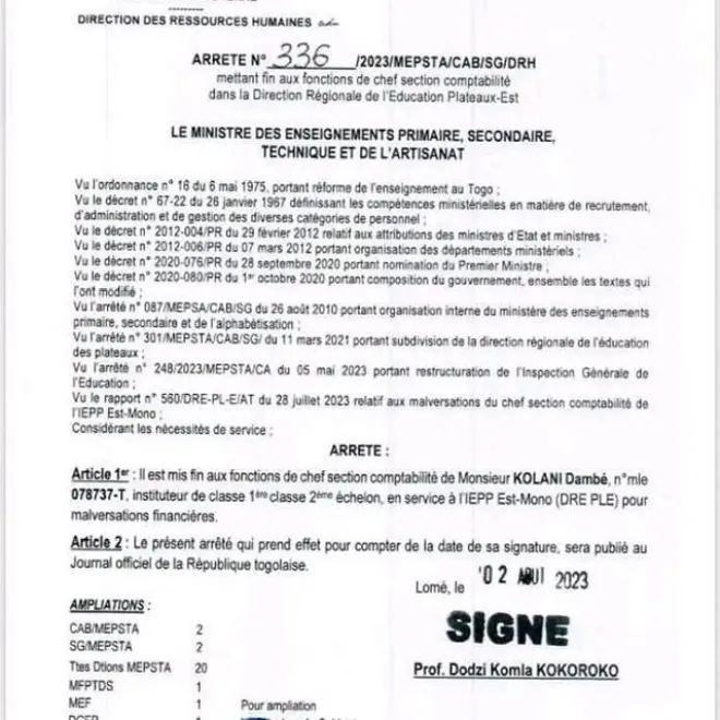Le Prof Dodzi Kokokoro, ministre des Enseignements primaire, secondaire, technique et de l’artisanat du Togo, a pris une décision ferme en mettant fin aux fonctions de M. Kolani Dambé, Chef de la section comptabilité en service à l’IEPP Est-Mono. Cette mesure a été officialisée par un arrêté daté du 2 août 2023, suite à des allégations de malversations financières.