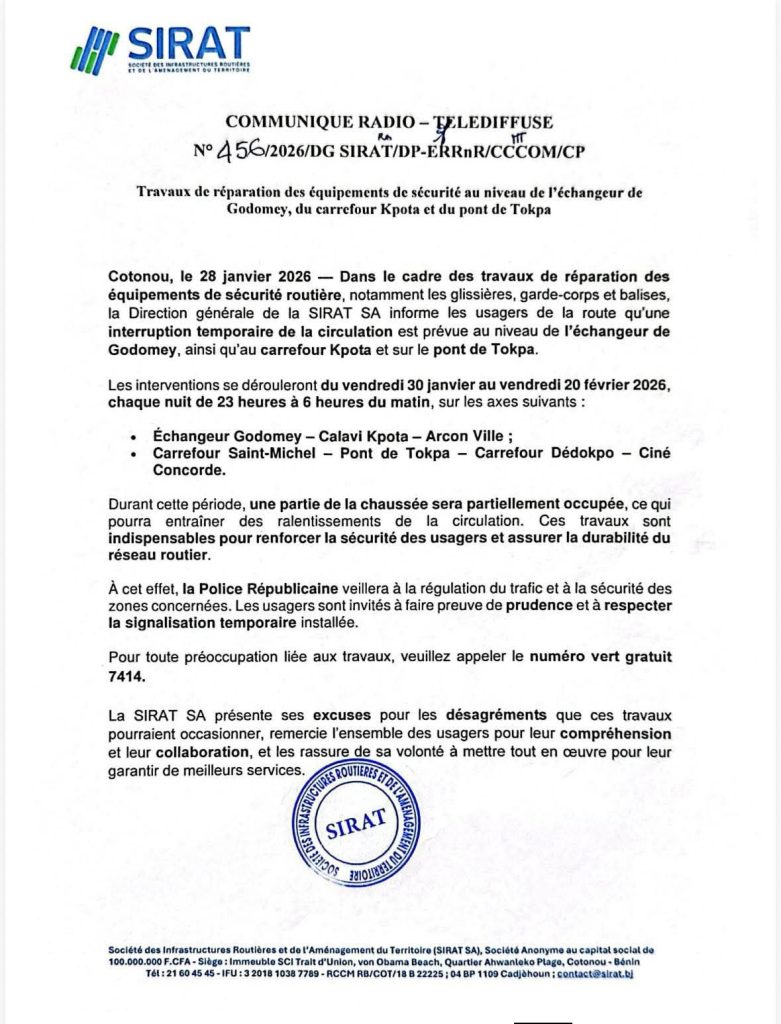 La Société des Infrastructures Routières et de l’Aménagement du Territoire (SIRAT SA) a annoncé des travaux de réparation des équipements de sécurité routière au niveau de l’échangeur de Godomey, du carrefour Kpota et du pont de Tokpa. Ces interventions concernent notamment les glissières, garde-corps et balises, essentiels à la sécurité des usagers.