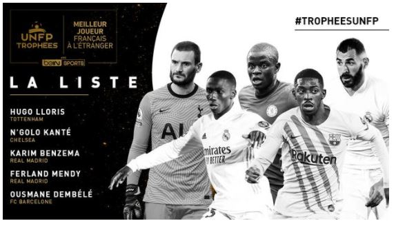 Pour le compte du Trophée UNFP du meilleur joueur français évoluant à l’étranger, la liste des 5 nommés a été publiée, ce mardi. Hugo Lloris (Tottenham), N’Golo Kanté (Chelsea), Karim Benzema (Real Madrid), Ferland Mendy (Real Madrid) et Ousmane Dembélé (FC Barcelone) sont les 5 expatriés nommés dans cette catégorie.