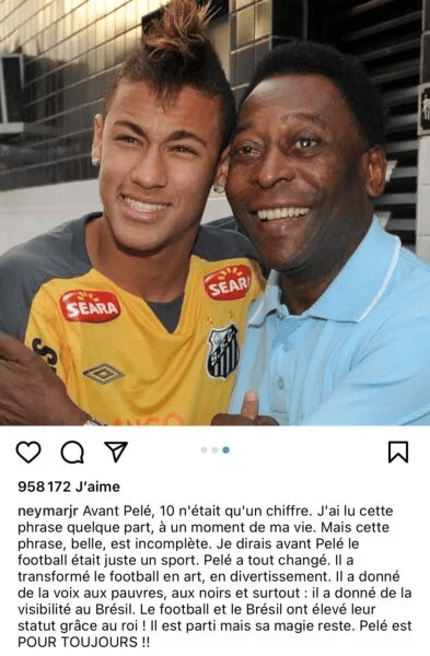 Sur son compte Instagram, Neymar Jr qui a toujours considéré Pelé comme une idole a réagi. « Avant Pelé, le football était juste un sport. Pelé a tout changé. Il a transformé le football en art », a posté la star parisienne.
