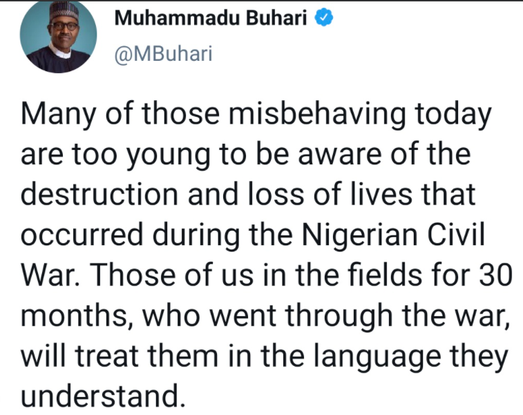 Dans le tweet à polémique, le président Buhari menaçait de traiter avec des « personnes » qui n’avaient rien appris de la guerre civile. « Beaucoup de ceux qui se conduisent mal aujourd’hui sont trop jeunes pour être conscients des destructions et des pertes de vies humaines survenues pendant la guerre civile nigériane. Ceux d’entre nous dans les champs depuis 30 mois, qui ont traversé la guerre, les traiteront dans la langue qu’ils comprennent », avait tweeté Buhari mardi, en réaction aux attaques généralisées contre des installations publiques par des incendiaires inconnus dans la région du Sud-Est.