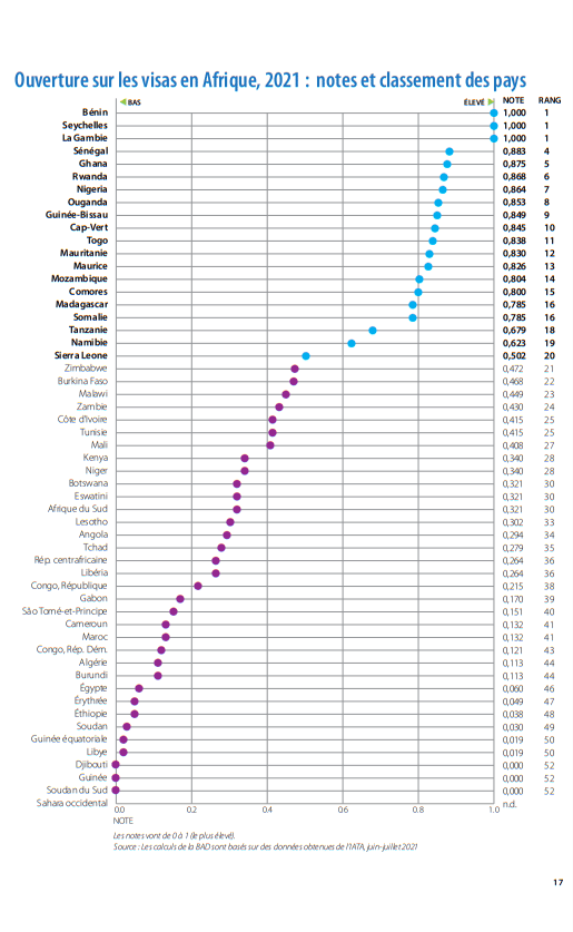 de déclarer leur ouverture en matière de visa aux citoyens des autres pays du continent : La note moyenne des 10 premiers pays sur l’indice d’ouverture sur les visas en Afrique est passée de 0,902 en 2020 à 0,904 en 2021″, peut-on lire dans le rapport. « Le Bénin, la Gambie et les Seychelles ont continué à offrir un accès sans visa à tous les Africains » affirme la rapport.