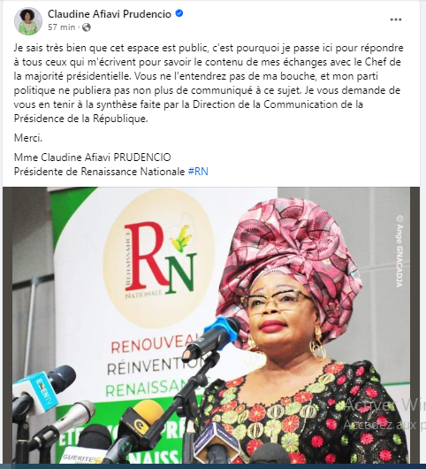 « Je sais très bien que cet espace est public, c’est pourquoi je passe ici pour répondre à tous ceux qui m’écrivent pour savoir le contenu de mes échanges avec le Chef de la majorité présidentielle. Vous ne l’entendrez pas de ma bouche, et mon parti politique ne publiera pas non plus de communiqué à ce sujet », a écrit Claudine Afiavi Prudencio. « Je vous demande de vous en tenir à la synthèse faite par la Direction de la Communication de la Présidence de la République », a-t-elle recommandé.