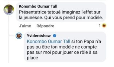 Sur la capture d’écran partagée sur sa page Facebook, l’on peut voir la web humoriste dans une tenue sans manche qui a mis en évidence son épaule et surtout son tatouage. Un fait qui a irrité l’un des internautes qui n’a manqué de lui faire le reproche. « Présentatrice tatouée, imaginez l’effet sur la jeunesse qui vous prend pour modèle« , écrit-il en commentaire sous la photo.